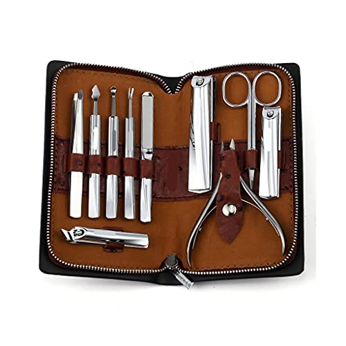 Conjunto de uñas multifuncional de 10 piezas: incluye raspador diagonal, archivo de uñas, clippers de uñas diagonales, pequeños alicates de uñas, cortadoras grandes de uñas, tijeras de cejas, pinzas, el tenedor de la piel muerta, la cucharada de la oreja, los alicates de la cutícula