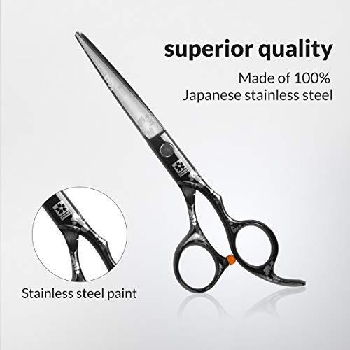 Tijeras de pelo de alta calidad: hechas de acero inoxidable de alta calidad con cuchillas precisas y bordes de corte afilados a mano para recortar uniformemente el cabello, barba o bigote. Estas tijeras de peluquería se pueden utilizar como tijeras de bigote y barba para hombres y también se pueden utilizar con cualquier tijeras de entresacar.