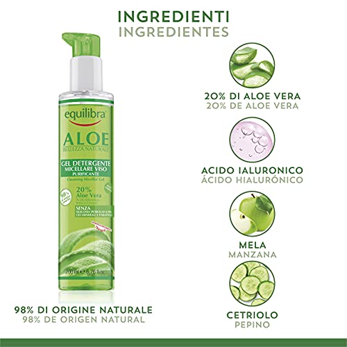El Gel Micelar Limpiador Facial Purificador Equilibra limpia sin irritar, eliminando todos los restos de maquillaje e impurezas y dejando la piel fresca, tonificada e hidratada. Las micelas, moléculas de aceite limpiador de origen vegetal seleccionadas por su eficacia y compatibilidad con la piel, capturan eficazmente las impurezas y los restos de maquillaje, facilitando su eliminación y limpiando suavemente la piel. Producto apto para pieles sensibles. Contiene micelas de origen vegetal, que limpian suavemente sin irritar, ácido hialurónico hidratante, glicerina vegetal, que devuelve la suavidad. Con un 20% de Aloe Vera que hidrata, protege y equilibra la piel del rostro. 98% de ingredientes de origen natural. Sin Siliconas y PEGs, Aceites Minerales y Parafina, SLES y SLS, ni Formaldehído. Fabricado en Italia. Modo de empleo: distribuir en la cara y el cuello, masajeando suavemente. Retirar con agua. Evitar el contacto con los ojos.