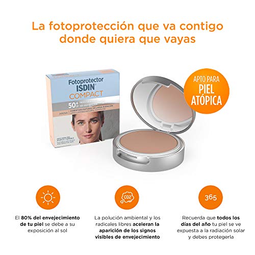 Especificaciones: Fotoprotector ISDIN Compact SPF 50+ Arena – Protector solar facial, Cobertura natural de larga duración, Apto para piel…