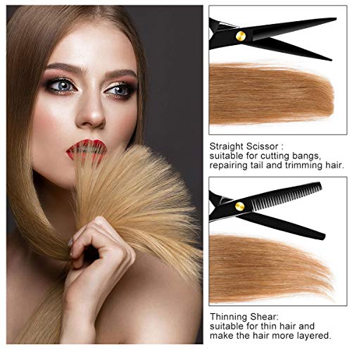 Juego de tijeras de pelo: el paquete incluye 1 tijeras de peluquería, 1 tijeras de entresacar, 1 peine de navaja, 1 peine de cuidado, 1 peine de cola, 2 pinzas de pelo, 1 capa de peluquería, 1 cepillo suave, 1 paño de limpieza, 1 bolsa de almacenamiento de piel. El juego de tijeras de peluquería satisface todas tus necesidades de corte de pelo y peinado.
