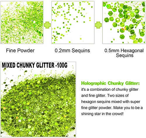 Especificaciones: JEMESI 100g Brillo Corporal, Purpurinas Polvo, Chunky Glitter Flakes Paillette Brillante Decoración para Cara Maquillaje…