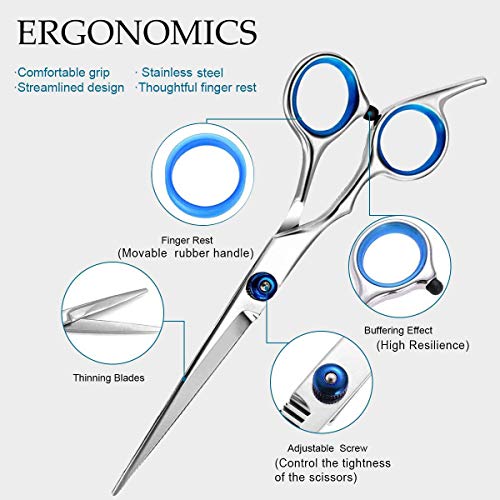 【Diseño Ergonómico】 El diseño ergonómico del mango con reposamanos e inserciones de goma para los dedos hace que las tijeras sean extremadamente cómodas de usar. Manija ajustada del dedo, a pesar de muchos tiempos de agarrar, no está cansado. El amortiguador al final de tijeras de peluquería profesional kit puede reducir efectivamente el desgaste y el ruido causado por la colisión del mango.
