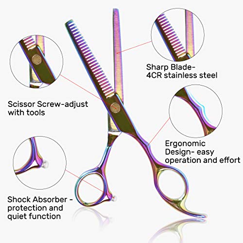【Diseño ergonomico】Con el diseño ergonómico de la curva de agarre puede reducir el uso de la muñeca, el codo y la fatiga de la mano, cómodo de usar.Además, las tijeras profesionales para cortar el cabello vienen con un tornillo de ajuste. Puedes ajustarlo a tu medida.