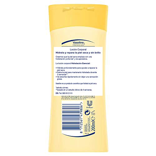 La loción corporal Vaseline Intensive Care Essential Healing hidrata la piel seca, áspera e irritada. Hidrata profundamente y restaura la piel muy seca, dejándola con un aspecto y una sensación más saludable. Con una fórmula hidratante no grasa de rápida absorción. Ofrece un alivio rápido para la piel seca y con picazón dejando tu piel profundamente hidratada.
